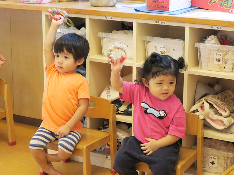 保育者や友だちとのやり取りを通してのコミュニケーションの楽しさや自分でできることの喜びを感じられるよう援助しています。