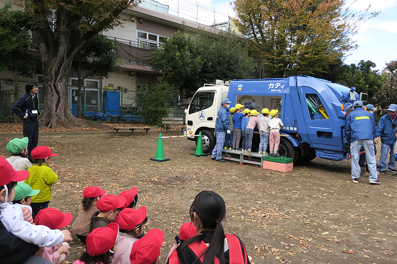 世田谷区の「環境学習プログラム」でゴミ収集車の「カティ君」と一緒にゴミ分別クイズやゴミ収集体験を行いました。